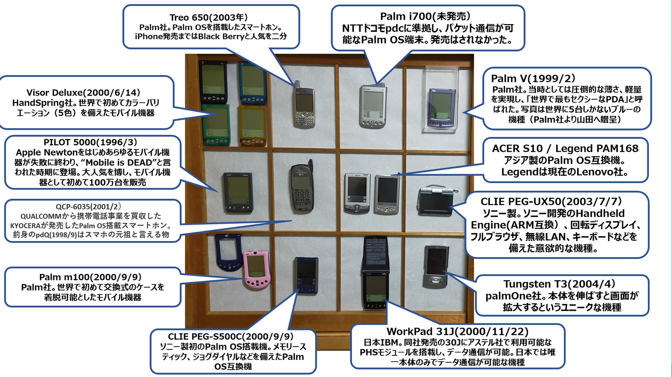 2021年01月11日 Palmコレクションの仮想背景 自室の障子をプラスティックのものに変えたため、以前からやってみたかった障子のコレクションボックス化に挑戦しました。これをWeb会議の仮想背景として使いたいという要望をいただきましたので、公開します。どなたでも自由にお使いください。また、これらの機種の説明をしたい方のために簡単な解説の図も作成しました。予習してからの利用をお勧めします(笑) タグ :#Palm#コレクション#web会議#仮想背景